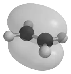 Alkenes such as ethene (shown to the right) have a carbon-carbon double bond. In such a double bond, there is significant electron density above and below the plane of the bond. Rotation around the bond is greatly restricted by a large energy barrier. For rotation to occur, groups attached to one of the double-bonded carbons would have to temporarily occupy this high electron density region, resulting in very high repulsion between the electrons in the group and the electrons in the double bond.