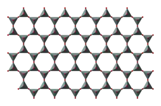 SiO4 tetrahedra can be arranged to form sheets, as illustrated to the right. The formula of such a sheet can be written (Si2O52−)n.