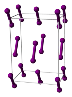 Contrast: Iodine is a simple diatomic, non-polar molecule. The only intermolecular force is the ID-ID force. It is easy to break this weak force and melt iodine; It melts at 387 K. The solid structure has a "herring-bone" pattern.