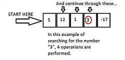 A linear search simply looks at each item in the list of values to be searched through until it finds the correct value. This is acceptably efficient for small amounts of data, however once the volume of data increases it becomes far less efficient. In Big O Notation, it can be defined as O(n), as the time taken for search increases proportionally to the number of data items being searched through.