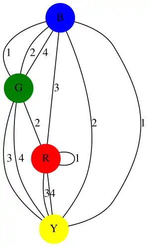 - edges represent mappings between opposite sides of the cube. For example, Cube 3 has a mapping: R opp B, this would be represented by an edge from R to B with the label '3' indicating that mapping belongs to cube 3.