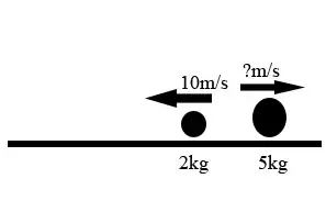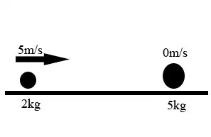 Now we know that momentum before = momentum after. So, . This may seem to be unworkable at first, but because velocity is a vector and the two balls are rolling in opposite directions, the 5 kg ball has a negative velocity.