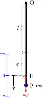 Let the point E denote the equilibrium position of the particle. At E, the particle is at rest (i.e. the resultant force acting on it is zero). Let denote the extension of the string when the particle is at E. Considering the vertical forces on the particle gives: