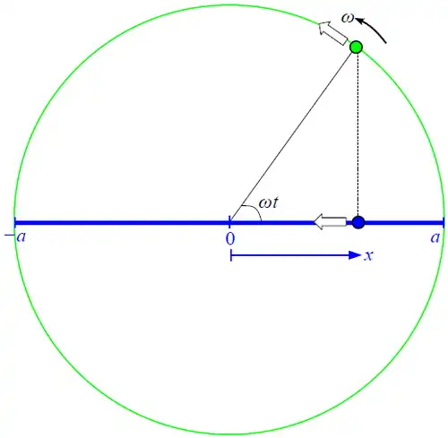 These equations show that is just the constant angular velocity (or angular frequency) associated with the SHM. The following figure illustrates this relationship between SHM and uniform circular motion (with an angular velocity of ). The displacement of the simple harmonic oscillator is really just the -coordinate of the particle performing uniform circular motion. We can therefore think of SHM as a projection of uniform circular motion onto the diameter of the circle.