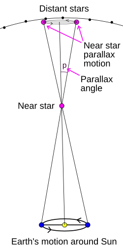 We can measure the angle of parallax a star makes as it appears to move across the background of distant stars when the Earth moves from two extreme points in its orbit. We assume that the distant stars are stationary. The diagram shows what is meant by the parallax of a star: