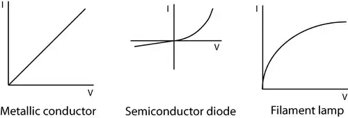 A diode and a filament lamp are two examples of non-ohmic conductors. The diode is designed to only allow current through in one direction, hence the use of negative values on its graph. The filament lamp doesn't have a constant temperature, which according to Ohm's law is required for a component to be an ohmic conductor. Instead, it heats up as a current passes through it, which has an effect on the resistance.
