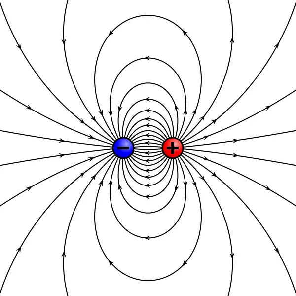 Around two oppositely charged spheres (known as a dipole), they look like the following:
