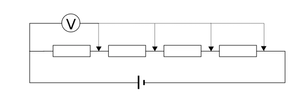 A potential divider, or potentiometer, consists of a number of resistors, and a voltmeter. The voltage read by the voltmeter is determined by the ratio of the resistances on either side of the point at which one end of the voltmeter is connected.