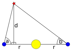 Let r be the radius of the Earth's orbit (assumed to be constant for simplicity's sake), a and b be the angles to the star (from the horizontal) when the Earth is on either side of the Sun, and let d be the perpendicular distance from the plane of the Earth's orbit to the star, as shown in the diagram on the right. By simple trigonometry: