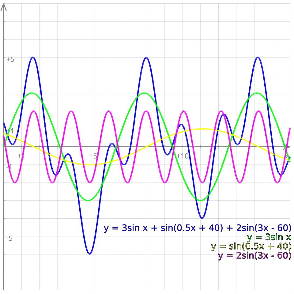 This signal is constructed from a number of different sine waves, with different frequencies, added together. These sine waves are as follows: