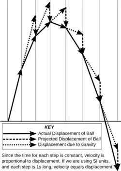 - Copy this vector, and connect its tail to the tip of the first vector. This new vector represents the velocity and displacement that the ball would have had over the next second, if gravity did not exist.