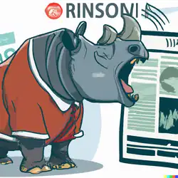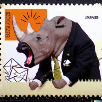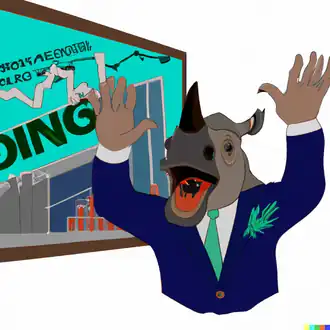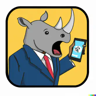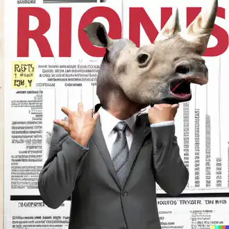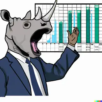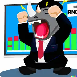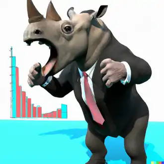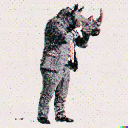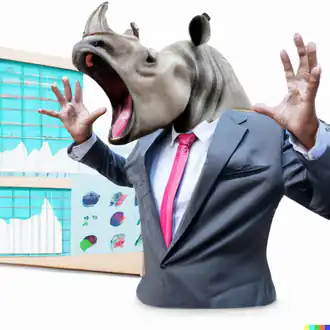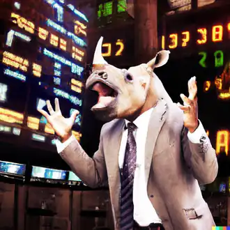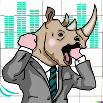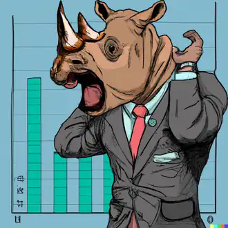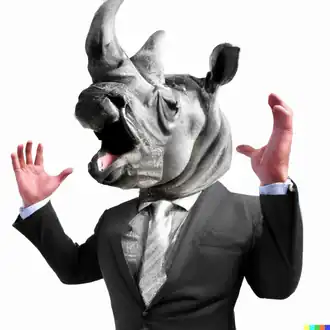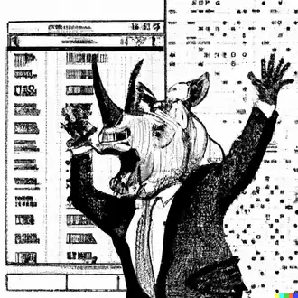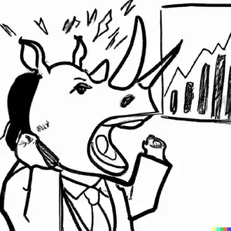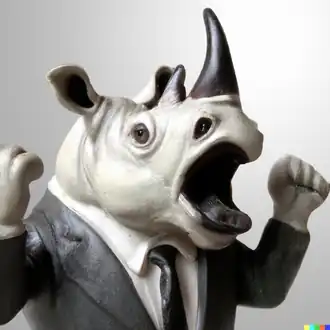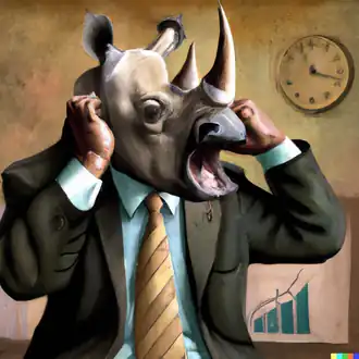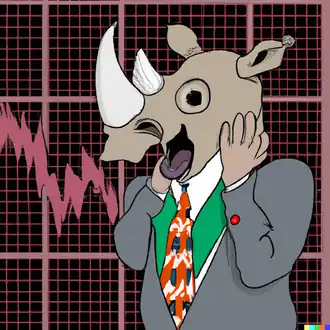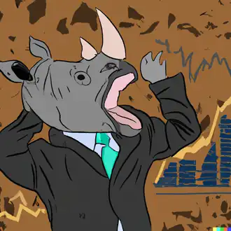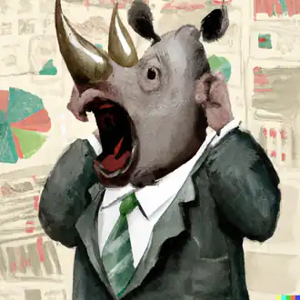 | DALL·E Javan rhinoceros wearing a business suit screaming aloud with hands on the cheek while seeing the stock price crash,