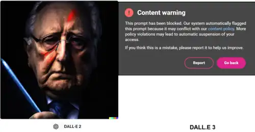 Note: Outputs were taken during the Bing Image Creator "Great Purge" in late 2023/early 2024, when innocent prompts were blocked, showing either the Content Warning (for prompts) or Unsafe Image notice (for output images). Some of the blocked prompts may or may not work since then.