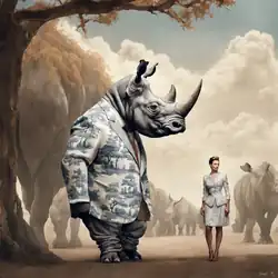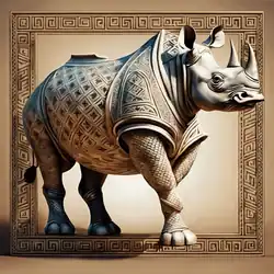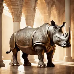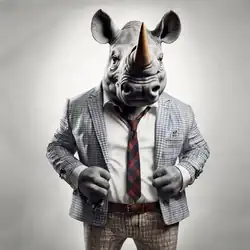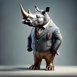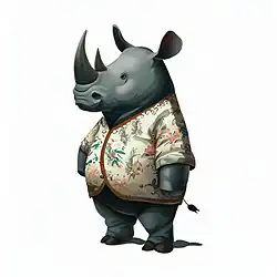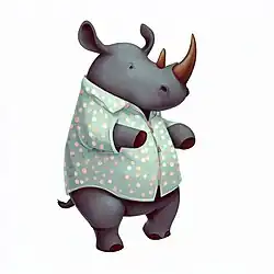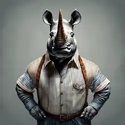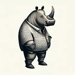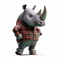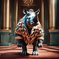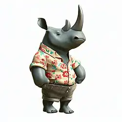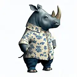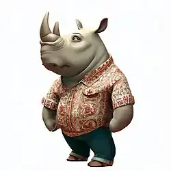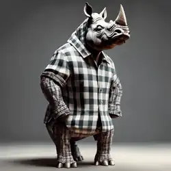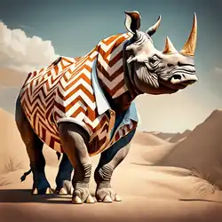 The prompt used is Anthropomorphic rhinoceros standing on two feet, wearing shirt with <<Pattern's Name>> pattern