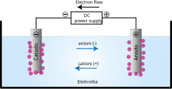 This is the opposite of a galvanic cell. In this kind of cell, a certain voltage is applied to a body of liquid, either the molten version of the salt, or the salt dissolved in water. This time one is adding energy to the system, meaning the standard cell potential will be negative. This current goes to the ions/molten salt and basically separates them out, giving you the pure version of whatever substance you are using. The "anode" is the metal that has the lower oxidation potential, the cathode with the lower reduction potential. This is mainly used to purify metals, and to extract pure substances from the salts.
