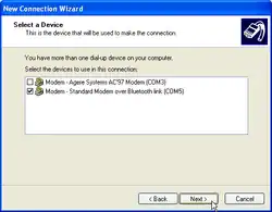 • Create a handset modem entry. If your handset connection (serial cable, USB cable, IrDA, Bluetooth) created a modem entry for your handset (e.g., Standard Modem over Bluetooth link), then you can skip to next major step (Create DUN connection); otherwise: