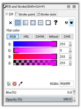 Blur and Opacity, posted at the bottom of the fill and Stroke dialogue are two often overlooked edits, these two color edits impact both the fill and the stroke. The Blur % edit provides 0.0 based increments from 0.0 to 100.0, with a default of 0.0. When working with blurs it is a good idea to set the Zoom to 100% (1). The Opacity (transparency) setting is similar to the color models "Alpha" setting, the difference is that the Opacity is applied to the entire (fill/stroke) object. A setting of 0% and the color is completely gone. One of the most used 0% settings is in the default creation of gradients, one gradient stop at Opacity 100% (full color) and the other stop set to no color (Opacity 0%).