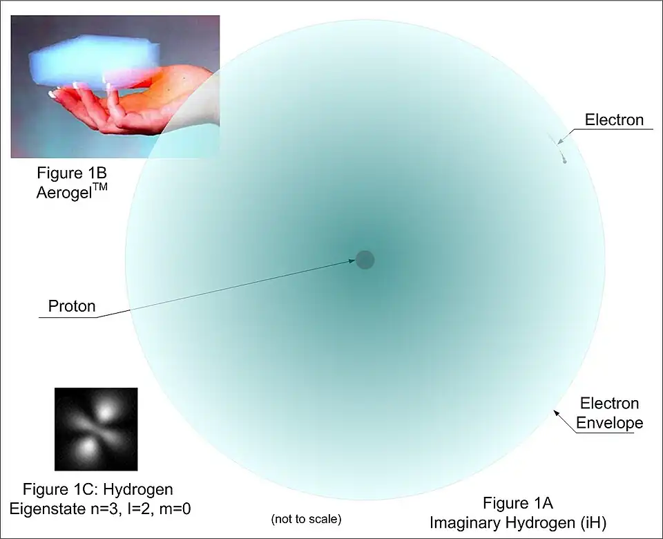 For reference, let us call this magic sphere “iH” for imaginary hydrogen. It is approximated in Figure 1A. Note the gossamer nature of the atom and that it is “see-thru”. So, it is much more accurate to visualize electrons as electron envelopes than as particles. A real-world visual analog is a substance called Aerogel® (Figure 1B; See also:Aerogel) that is 99% empty space! Note this is not like a gas or air. It is a state of matter with attributes that change with the number of protons, electrons and neutrons. To “poke” another electron envelope within a “shell” of electron envelopes requires specific conditions. These conditions vary with each element and current conditions such as heat and pressure. Furthermore, depicting the iEn as a sphere is a simplification. More accurate is to show the iEn as eigenstate orbitals. Figure 1C shows the eigenstates for iH where the probability of the electron’s position and velocity is proportional to the figure’s brightness. In actuality, the orbitals are in constant “rotation” about the nucleus. The sphere of Figure 1A is indicative of the boundary of rotation of these orbitals.