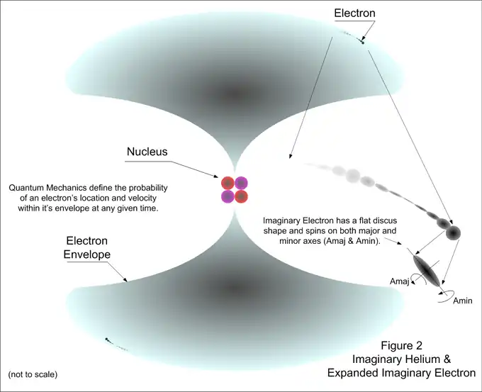 What might imaginary helium (iHe) look like? The mass of iH is equal to the mass of one electron plus one proton while the mass of helium is equal to the mass of two electrons plus two protons plus two neutrons, or four times that of iH. But the shape of iHe is more like a dumbbell than a sphere. Figure 2 shows two protons and two neutrons at the center of opposing electronic envelopes. Due to like charges each electron has trouble violating the others envelope, and as they must maintain nearly the velocity of light, they seem to be everywhere in their own envelope at once. One must imagine these envelopes as three dimensional coming out of the page as well as below, more like an apple eaten down to the core!