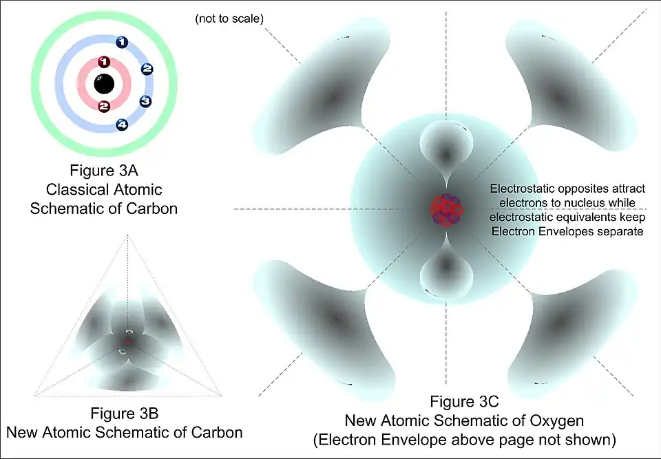 Figure 3A shows a typical middle school rendering of the carbon atom. Such a view is inaccurate and makes nuclear electro-mechanics more difficult to comprehend. The imaginary carbon (iC, Figure 3B) and imaginary oxygen (iO, Figure 3C) is more realistic and will lead to a much more intuitive understanding of chemical bonding (the dotted lines are for visual reference only). Performing the "thought experiment" of imagining the push-pull of electromagnetic forces upon these various particles, one can "see" how these subatomic components hold together. The two electrons in the innermost shell of Figure 3C are compelled to “fall” towards the nucleus, repel one another, and maintain near light speed. The four electrons in the outer shell are in a similar predicament, rapidly organization into synchronized equilibrium. This equilibrium is what defines substances and gives rise to their crystallization characteristics and chemical properties. Note that the Figure 3B model of carbon is an equilateral tetrahedron (a triangle in 3 dimensions). Triangles are among the strongest geometric forms, and equilateral triangles are the strongest triangles. Equilateral tetrahedrons are the strongest 3D shapes, and perfect for turning soft carbon or graphite to that hardest of natural substances... Diamonds! The more one learns about Nature, the more one can appreciate the connections from algebra to zoology. Nature can be wonderfully logical!