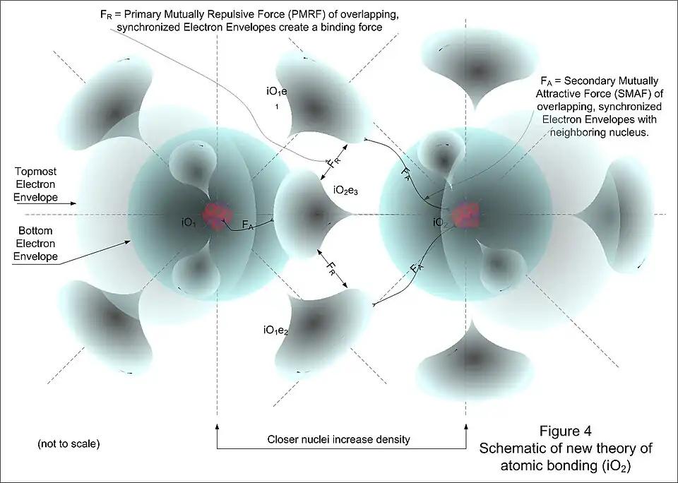Noting that the space between all components of iO would be orders of magnitude greater than this page can show, Figure 4 shows schematically how two iO could bond. Assume that for whatever reasons that electron iO2e2 has come well into the influence of iO1e1 and iO1e2 as shown. We say they are sharing their shells. Since electrons repel each other electromagnetically atom iO1 and atom iO2 are now coupled together by the force labeled FR. Additional bonding force (FA) is supplied by the displaced of iO1e1 and iO1e2 being attracted to iO2’s nucleus. This is much like linking your knuckles together and attempting to pull your hands apart. But if electrons repel how could they get into such a configuration to begin with? Either by pressure & heat, or catalytically, or electromagnetically. If the pressure and heat is sufficient, the electron envelopes deform allowing the outer shells to slip amongst one another. This is how the sun and deep earth turn carbon to diamond. If a catalyst has the correct properties, it can pull the electron envelopes apart creating a “hole” for another envelope to slip into, freeing the catalyst to slip away for another reaction. This is how catalytic converters convert automobile emissions to less toxic substances. Electromagnetically, electron envelopes may be pulled apart creating a “hole” for coupling. This is how “buckyballs” are created in an electric arc.