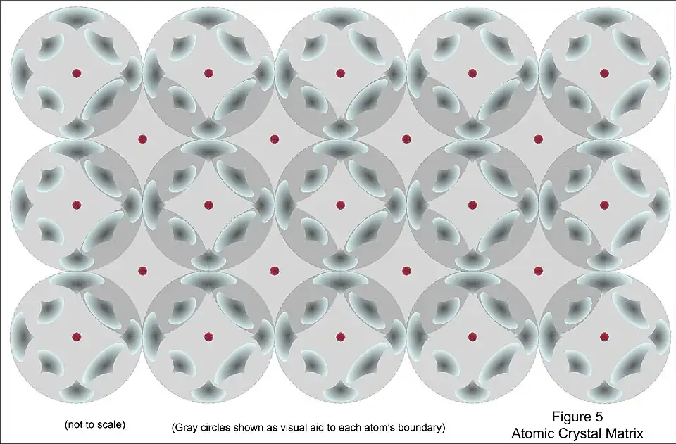 This new schematic view of atomic structure lends itself well to showing how atoms form crystalline structures. Figure 5 shows such a matrix schematically (inner shell removed for clarity). Again, this is a 2-D analog of a 3-D structure, so one must imagine some of the electron envelopes going under the page while others extend above the page (the gray circles are for visual boundary reference only).
