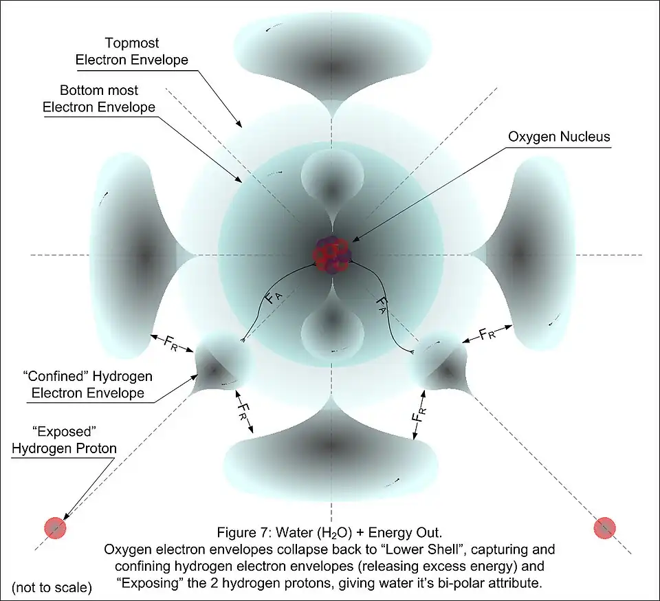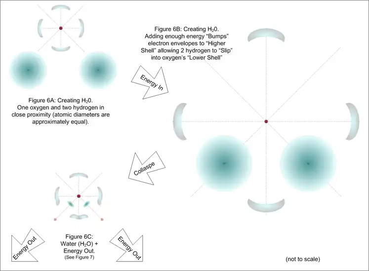 When oxygen releases the energy previously gained, its electron envelopes fall back to their “lower shell”, but now, all three atoms' mutually repellent electron forces “squeeze” the hydrogen envelopes releasing more energy (Figure 6C). Note, that the iEn volume of a free iH is much reduced. This reduction is a tremendous loss of energy. Think about this: If 2 volumes of iH are mixed with 1 volume of iO and ignited, a huge amount of energy is released and the resultant volume of water is much smaller than the original 3 volume units!
