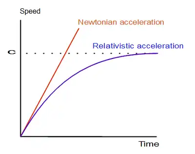 Consider a rocket accelerating from rest at a constant acceleration of 1g. What do we actually mean by this, taking relativistic effects into account? Obviously the rocket cannot go on increasing its speed at a constant rate (from the point of view of someone who remains at rest), because it would eventually travel faster than light. What happens is that the rocket approaches the speed of light exponentially like this.
