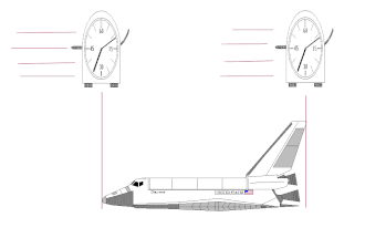 I observe him doing his calculations. He starts to press the 6 and the 0 buttons. 'No, that's wrong!' I exclaim. 'My ship is not 60 m long it is 100 m long!' Then I watch him divide by the time 0.25. 'No, that's wrong too,' I exclaim. 'Your clocks are running slow! You should be dividing by 0.417 not 0.25!' (0.417 is of course 0.25 x 1.67) Grabbing a calculator I perform the calculation for him - only to get... 100/(0.417 x 10−6) = 240,000,000 ms−1! So it doesn't matter who does the calculations, we still get the same result. Each of us is convinced that the other has used the wrong data but we both agree about the answer!