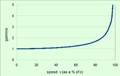 This means that the clocks on board the ship (and everything else as well) appear to me to run slow by a factor of or, as it is more usually written. This factor is often called (the greek letter gamma) and is always greater than one. It rises to as v gets closer and closer towards c.