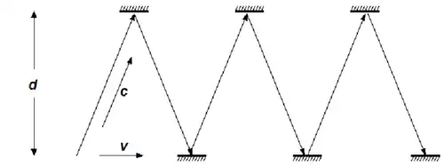 Now suppose you are watching such a light clock passing by in a spaceship travelling at a sizeable fraction of the speed of light v. (Of course you can't see the light beam but you can imagine it!) The arm of the clock is at right angles to the direction of motion of the ship so you have no difficulty in verifying that the arm has a length l as the ship goes by. On the other hand, you can see (imagine!) the light beam moving in a diagonal line like this:
