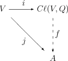 (where 1 denotes the multiplicative identity of A), there is a unique algebra homomorphism f : Cℓ(V,Q) → A such that the following diagram commutes (i.e. such that f o i = j):