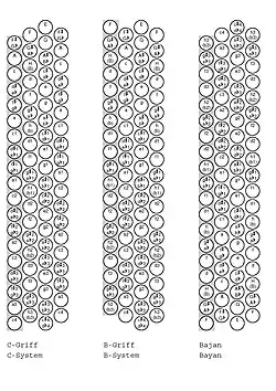 There are two common free-bass systems: one is the chromatic free bass, where the notes move in a chromatic pattern upwards or downwards (see chart at right). The other is the quint bass system, which has a note system similar to the Stradella bass layout, but spread over several octaves. The former system gives you around five octaves of range in the left hand, and the latter about three without a register change. Usually, only big and expensive accordions have free-bass and it is still a relatively new concept; chances are the instrument you have, or are looking to buy, does not have it. As a beginning accordionist, you should not be too worried about it. Small bassetti accordion models are available, having a reduction in their range (or scope) for the novice and younger performer.