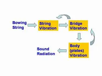 When a violinist bows a string, which can produce vibrations with abundant harmonics, the vibrations of the strings are structurally transmitted to the bridge and the body of the instrument through the bridge. The bridge transmits the vibrational energy produced by the strings to the body through its feet, further triggering the vibration of body. The vibration of the body determines sound radiation and sound quality, along with the resonance of the cavity.