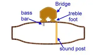 The sound post connects the flexible belly to the much stiffer back plate. The sound post can prevent the collapse of the belly due to high tension force in the string, and, at the same time, couples the vibration of the plate. The bass bar under the belly extends beyond the f holes and transmits the force of the bridge to a larger area of the belly. As can be seen in the figure, the motion of the treble foot is restricted by the sound post, while, conversely, the foot over bass bar can move up and down more easily. As a result, the bridge tends to move up and down, pivoting about the treble foot. The forces appearing at the two feet remain equal and opposite up to 1 kHz. At higher frequencies, the forces become uneven. The force on the soundpost foot predominates at some frequencies, while it is the bass bar foot at some.