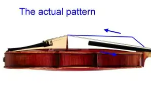 The vibration pattern of the strings can be easily be observed. To the naked eye, the string appears to move back and forth in a parabolic shape (see figure), which resembles the first mode of free vibration of a stretched string. The vibration of strings was first investigated by Hermann Von Helmholtz, the famous mathematician and physicist in 19th century. A surprising scenario was discovered that the string actually moves in an inverse “V” shape rather than parabolas (see figure). What we see is just an envelope of the motion of the string. To honor his findings, the motion of bowed strings had been called “Helmholtz motion.”