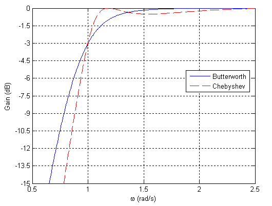 The Chebyshev algorithm is an alternative to the Butterworth algorithm. For the Chebyshev response, the maximally-flat passband restriction is abandoned. Now, a ripple, or fluctuation is allowed in the pass band. This allows a steeper transition or roll-off to occur. In this type of application, the low-frequency response of the loudspeaker can be extended beyond what can be achieved by Butterworth-type filters. An example plot of a Chebyshev high-pass response with 0.5 dB of ripple against a Butterworth high-pass response for the same is shown below.
