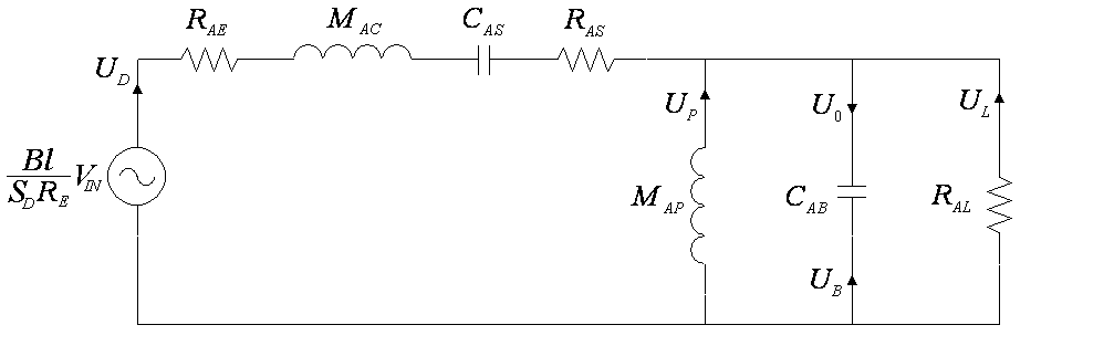 Unlike sealed enclosure analysis, there are multiple sources of volume velocity that radiate to the outside environment. Hence, the diaphragm volume velocity, , is not analyzed but rather . This essentially draws a “bubble” around the enclosure and treats the system as a source with volume velocity . This “lumped” approach will only be valid for low frequencies, but previous approximations have already limited the analysis to such frequencies anyway. It can be seen from the circuit that the volume velocity flowing into the enclosure, , compresses the air inside the enclosure. Thus, the circuit model of Figure 3 is valid and the relationship relating input voltage, to may be computed.