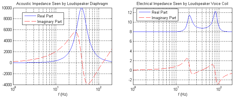 It is important to note the parallel combination of and . This forms a Helmholtz resonator (click here for more information). Physically, the port functions as the “neck” of the resonator and the enclosure functions as the “cavity.” In this case, the resonator is driven from the piston directly on the cavity instead of the typical Helmholtz case where it is driven at the “neck.” However, the same resonant behavior still occurs at the enclosure resonance frequency, . At this frequency, the impedance seen by the loudspeaker diaphragm is large (see Figure 3 below). Thus, the load on the loudspeaker reduces the velocity flowing through its mechanical parameters, causing an anti-resonance condition where the displacement of the diaphragm is a minimum. Instead, the majority of the volume velocity is actually emitted by the port itself instead of the loudspeaker. When this impedance is reflected to the electrical circuit, it is proportional to , thus a minimum in the impedance seen by the voice coil is small. Figure 3 shows a plot of the impedance seen at the terminals of the loudspeaker. In this example, was found to be about 40 Hz, which corresponds to the null in the voice-coil impedance.