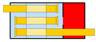 The upper right image represents a car muffler's typical architecture. It is composed of 3 tubes. There are 3 areas separated by plates, the part of the tubes located in the middle area are perforated. A small quantity of pressure "escapes" from the tubes through the perforation and cancel one another.