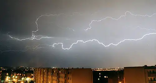 Thunder is the sound made by lightning. Depending on the nature of the lightning and distance of the listener, thunder can range from a sharp, loud crack to a long, low rumble (brontide). The sudden increase in pressure and temperature from lightning produces rapid expansion of the air surrounding and within a bolt of lightning. In turn, this expansion of air creates a sonic shock wave which produces the sound of thunder, often referred to as a clap, crack, or peal of thunder. The distance of the lightning can be calculated by the listener depending on when the sound is heard vs. the vision of the lightning strike.