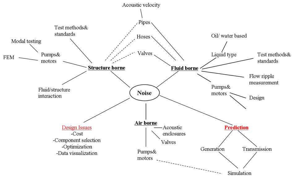 Fig.3 Domain of hydraulic system noise generation and transmission (Figure recreated from [1])