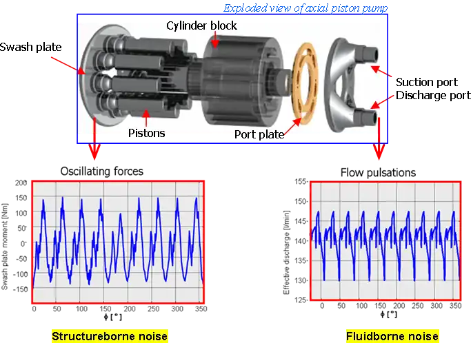 In swash plate type pumps, the main sources of the structureborne noise are the fluctuating forces and moments of the swash plate. These fluctuating forces arise as a result of the varying pressure inside the displacement chamber. As the displacing elements move from suction stroke to discharge stroke, the pressure varies accordingly from few bars to few hundred bars. These pressure changes are reflected on the displacement elements (in this case, pistons) as forces and these force are exerted on the swash plate causing the swash plate to vibrate. This vibration of the swash plate is the main cause of structureborne noise. There are other components in the system which also vibrate and lead to structureborne noise, but the swash is the major contributor.