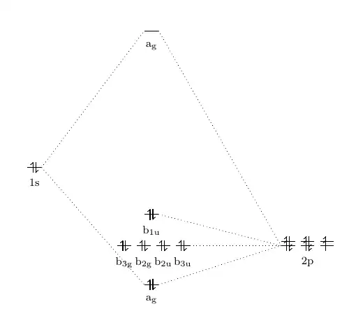 As mentioned before, if an atomic orbital cannot find any other orbital with similar symmetry, then it will remain as non-bonding molecular orbital. The non-bonding molecular orbitals normally have the same energies as the atomic orbitals that form them, although there are some special cases can happen (not in diatomic MO, but in some metal complex). For example, in the ion FHF-, by solving the irreducible representation, it can be found that the base of FHF- has ag, b2u, b3u, b2g, b3g and b1u. However, since the H atom has only a 1s orbital, it can only form molecular orbitals with ag. Therefore, b2u, b3u, b2g, b3g and b1u will remain as non-bonding molecular orbitals. Also, notice that b1u has a higher level in energy state. This can be caused by the extreme unsymmetrical structure of this molecular orbital. Another guess of the increase in the b1u energy level can be the slightly mixing with the 2s orbital from two fluorines.