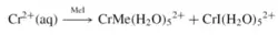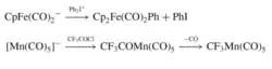 2. Electrophilic attack can also occur when the anionic metal complex is strong enough of a nucleophile to attack an alkyl and acyl halides in an electrophilic attack (figure 3). For this occurrence, the metal needs to have a readily available lone pair and open coordination site. The negative charge is shifted to the electrophile's leaving group while the overall charge of the complex increased by 1 [1].