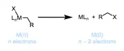 Reductive elimination, as shown in figure 7, involves eliminating a molecule from a transition metal complex where the metal is reduced via 2 e-'s. Elimination occurs in the cis orientation with groups being eliminated. An unstable oxidative state can encourage the elimination to proceed [1]. In details, the alkyl ligand interacts with a second type of ligand on the metal, in which the metal is consequently reduced by 2 units, a total electron count reduction by 2. Reductive elimination is generally favorable thermodynamically when X = H. However, reductive elimination is not favorable when X = halogen.