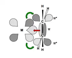 Linear π systems include alkenes, alkynes, and other unsaturated compounds containing π bonds. The ligand donates electron density from its π bonding orbitals to the d-σ orbitals on the metal center in a σ fashion; therefore the ligands HOMO is interacting with the metals LUMO. There is also back donation from the metal centers d orbital to the ligands π* orbitals in a π fashion, and in this case the metals HOMO is interacting with the ligands LUMO. With these types of interactions the ligand is a σ donor and π acceptor. In this type of bonding, the C-C bond strength within the ligand is weakened and the bond is lengthened in comparison to its free form. This can be attributed to the donation of electron density removing π-bonding electron density within the ligand, and the donation of electrons to the π* orbitals in the ligand.[1][2]