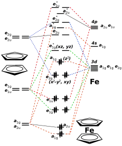 Ferrocene is the most widely studied metallocene with in the field of organometallics. Looking to the molecular orbital diagram, orbitals that are occupied by electrons are stabilized by the interactions with iron, and are typically that of s and p type orbitals. The orbitals of the most interest are that of the HOMO (dz2) and the LUMO (dxz, dyz). In the case of the HOMO the orbital has mostly metal characteristics as it is cone-shaped and has very little overlap with the orbitals of the ligand, making it almost non-bonding. The LUMO however has a large overlap of the d orbital on the metal and p orbitals of the carbons on the Cp ligands, allowing for π bonding.[2]