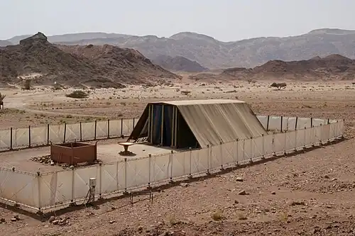 According to the Hebrew Bible, a Tabernacle was the portable dwelling place for the divine presence from the time of the Exodus from Egypt through the conquering of the land of Canaan. Built to specifications revealed by God to Moses at Mount Sinai, it accompanied the Israelites on their wanderings in the wilderness and their conquest of the Promised Land. The First Temple in Jerusalem superseded it as the dwelling-place of God.