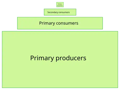 An Ecological Pyramid (or Trophic pyramid) is a graphical representation designed to show the biomass or productivity at each trophic level in a given ecosystem. Biomass pyramids show the abundance or biomass of organisms at each trophic level, while productivity pyramids show the production or turn-over in biomass. Ecological Pyramids begin with producers on the bottom and proceed through the various trophic levels, the highest of which is on top.